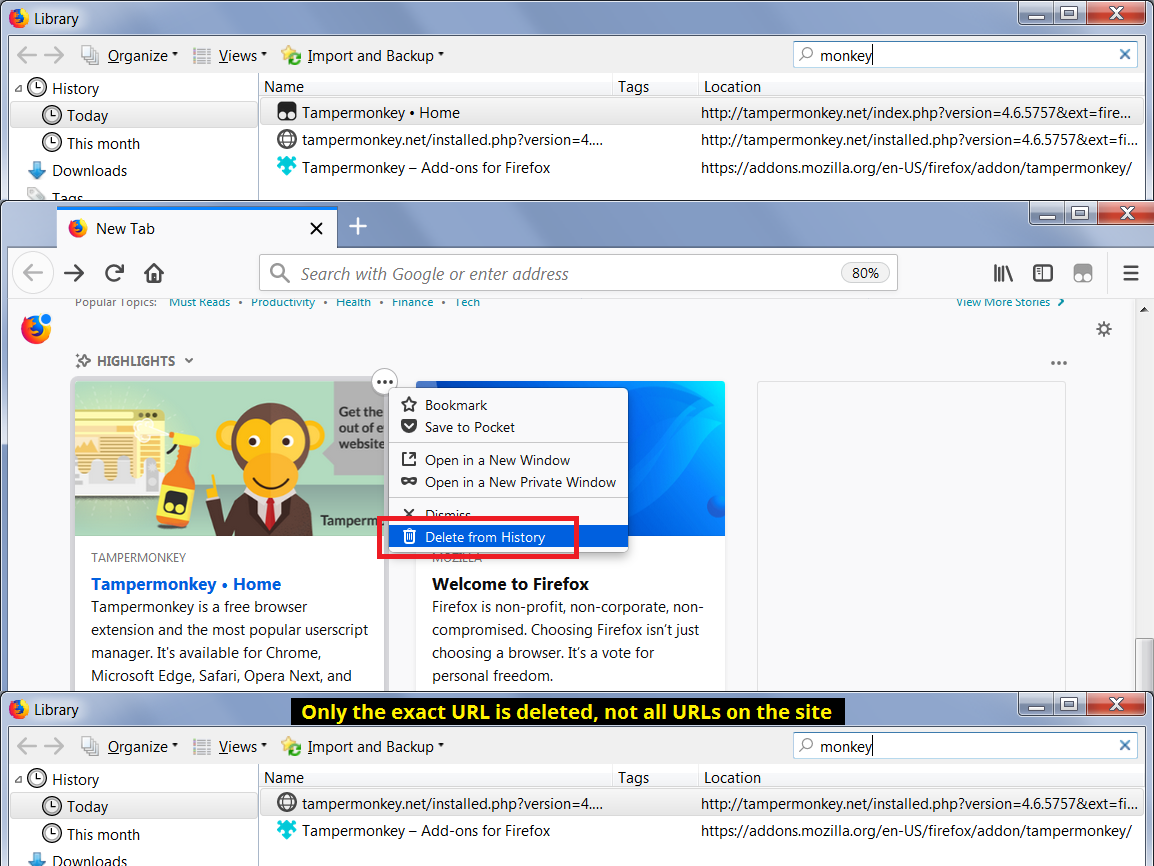 Bug in Highlights section of New Tabs? "Delete from History" is ineffectual.
