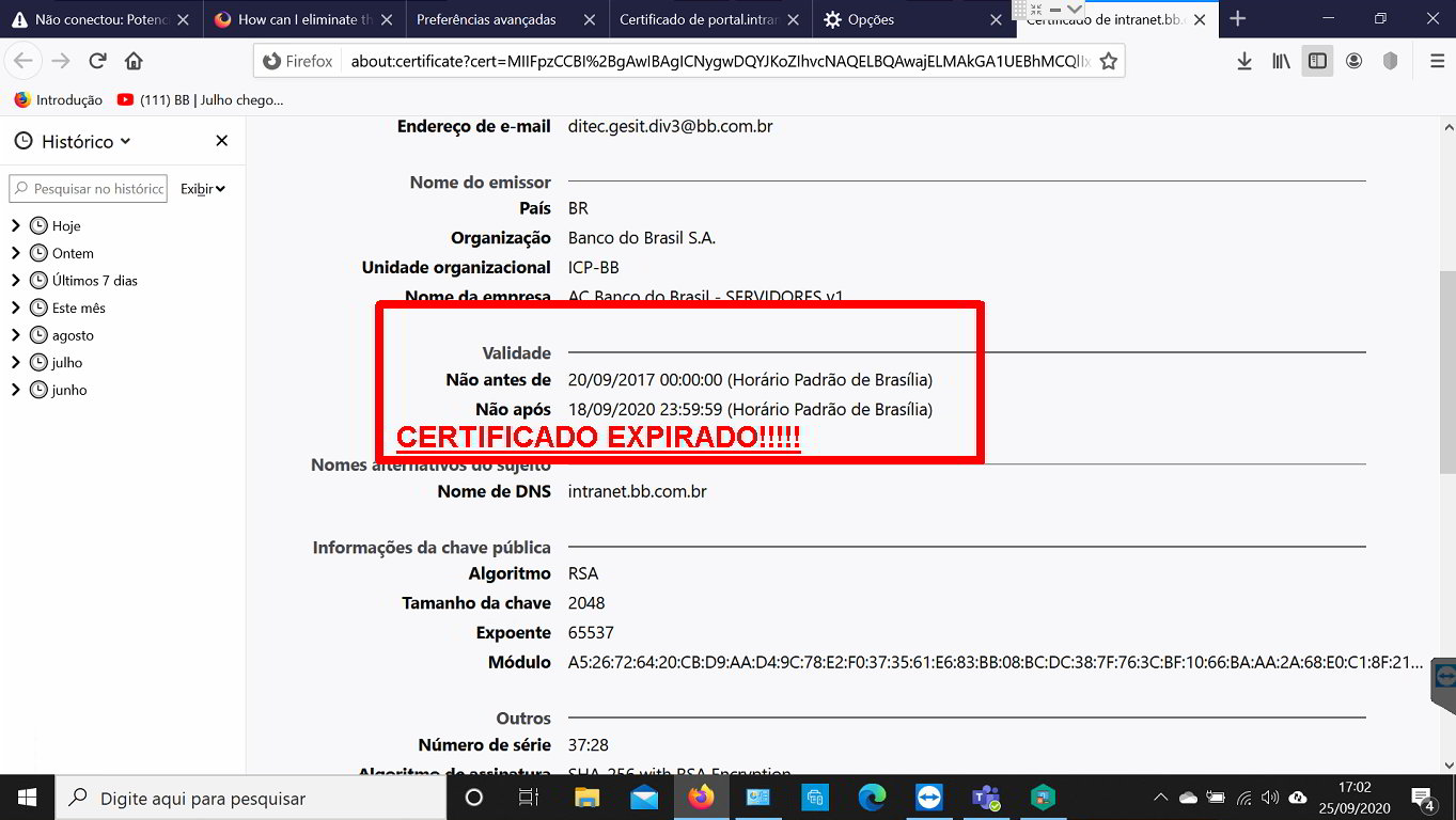Estou trabalhando em casa por pertencer ao grupo de risco coronavirus Até o dia 18/09/2020 o Firefox conectava normalmente a partir dai não consegui mais pois ela alega que o certificado está vencido.Tenho tentado junto a DITEC resolver o problema ela simplesmente me envia uma mensagem "Recomendamos que seja realizada a limpeza de cache do browser,com o browser(firefox)aberto na tela,pressionando simultaneamente++selecionar o intervalo(tudo) e marcar todos os campos,clicar em ok fechar todas as abas do firefox e em seguida abrir o browser novamente e realizar o login nas ferramentas normalmente. Certificados podem ser encontrados em http://pki.bb.com.br/ selecionar o browser que está usando e seguir tutorial". Agradeço a quem puder me orientar. Att Olympio
