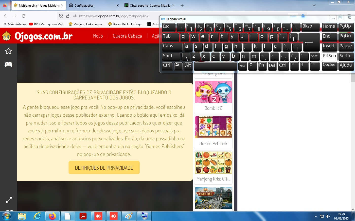 Olá, O site está dizendo que as configurações de privacidade do Firefox estão bloqueando o carregamento do jogo, mesmo depois de você autorizar. Isso acontece porque o Firefox bloqueia por padrão alguns conteúdos de terceiros (cookies, rastreadores e scripts), e os jogos desse site usam exatamente esse tipo de recurso.