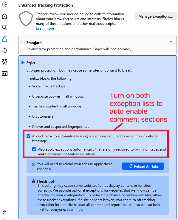 If you don't want to rely on Firefox's built-in convenience list, you can make manual exceptions for popular comment systems. Here's how: