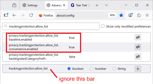 (2) In the search box in the page, type or paste trackingprotection.allow_list and pause while the list is filtered. Firefox should display two or three preferences - the relationship to the checkboxes is as follows: