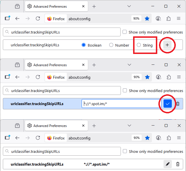 (2) In the search box in the page, type or paste urlclassifier.trackingSkipURLs and pause while the list is filtered. Usually this won't match any existing preference, and you will only see a bar with the Boolean Number String options and a + button. If the preference already exists, double-click it to display an editing field and skip to #4.