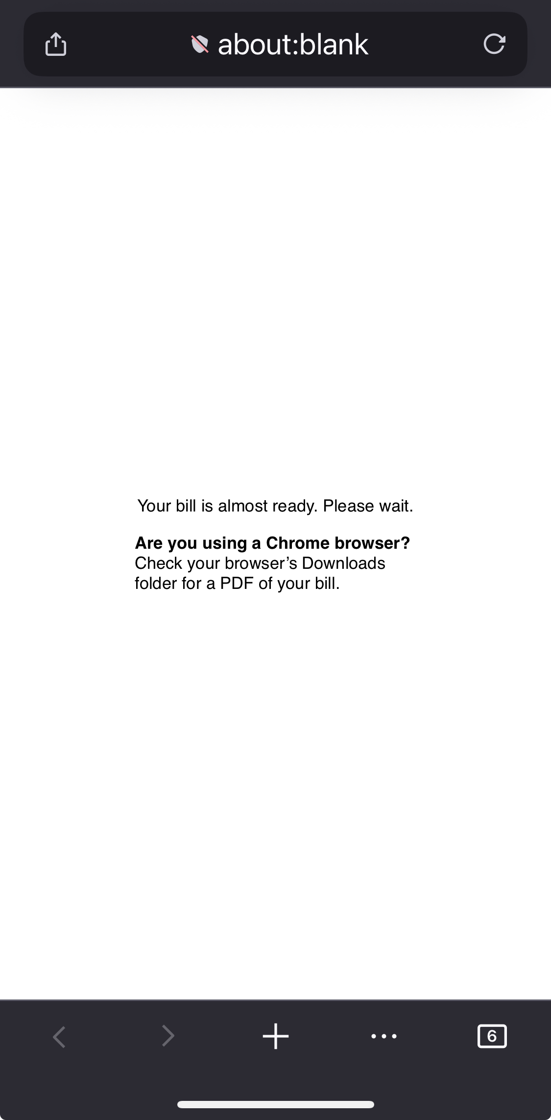 Hi, I am having an issue in mobile on iPhone 13 mini where I am trying to view a PDF (a bill so I can’t share the link) and it just opens to a about:blank page that says: “Your bill is almost ready. Please wait. Are you using a Chrome browser? Check your browser’s Downloads folder for a PDF of your bill.” I wait and nothing happens. When I try in chrome it opens immediately in another tab (and doesn’t go to the downloads folder funny enough). It isn’t in my downloads folder here either. I don’t think it’s the site since it works in chrome. I tried turning off pop up blocker, clicking the link again, and it didn’t change anything. I also notice it is labeling the blank page as an insecure connection. It is from my city electric company so that wouldn’t be likely. Thank you
