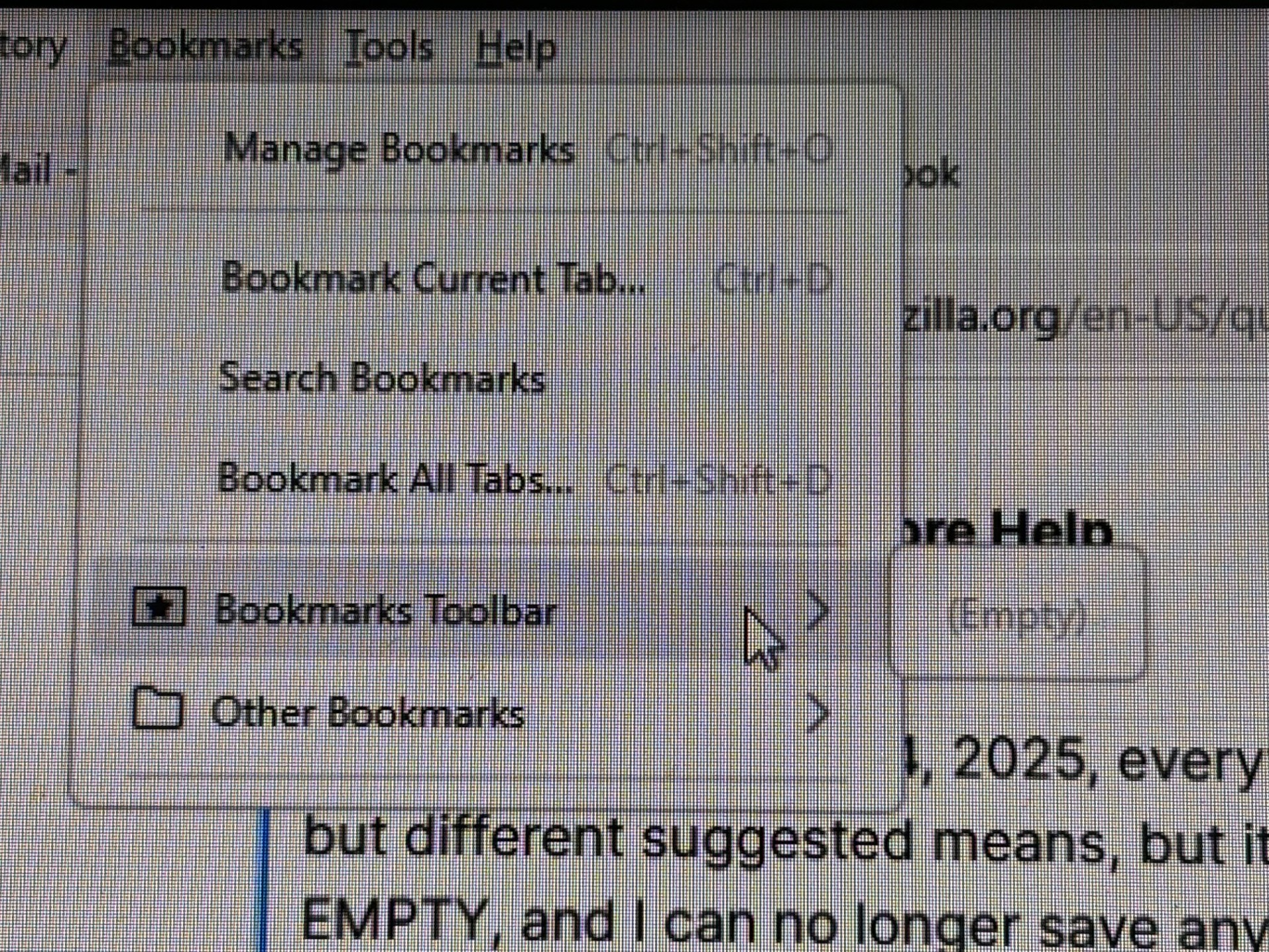 As of yesterday, Oct. 14, 2025, everything in my Firefox Bookmarks and History is gone. This is the message displayed: "The bookmarks and history system will not be functional because one of Firefox's files is in use by another application. Some security software can cause this problem." I have tried to recover them by different suggested means, but it would appear there is NOTHING to recover. Everything in Bookmarks says EMPTY, and I can no longer save any new Bookmarks, it just not allowed. How and why did this happen, and what am I supposed to do? I had hundreds of things Bookmarked, many of them were important to how I run my business, and now are seemingly all gone. This is very upsetting and would appreciate Mozilla getting this straighten out. I need and explanation and resolution.