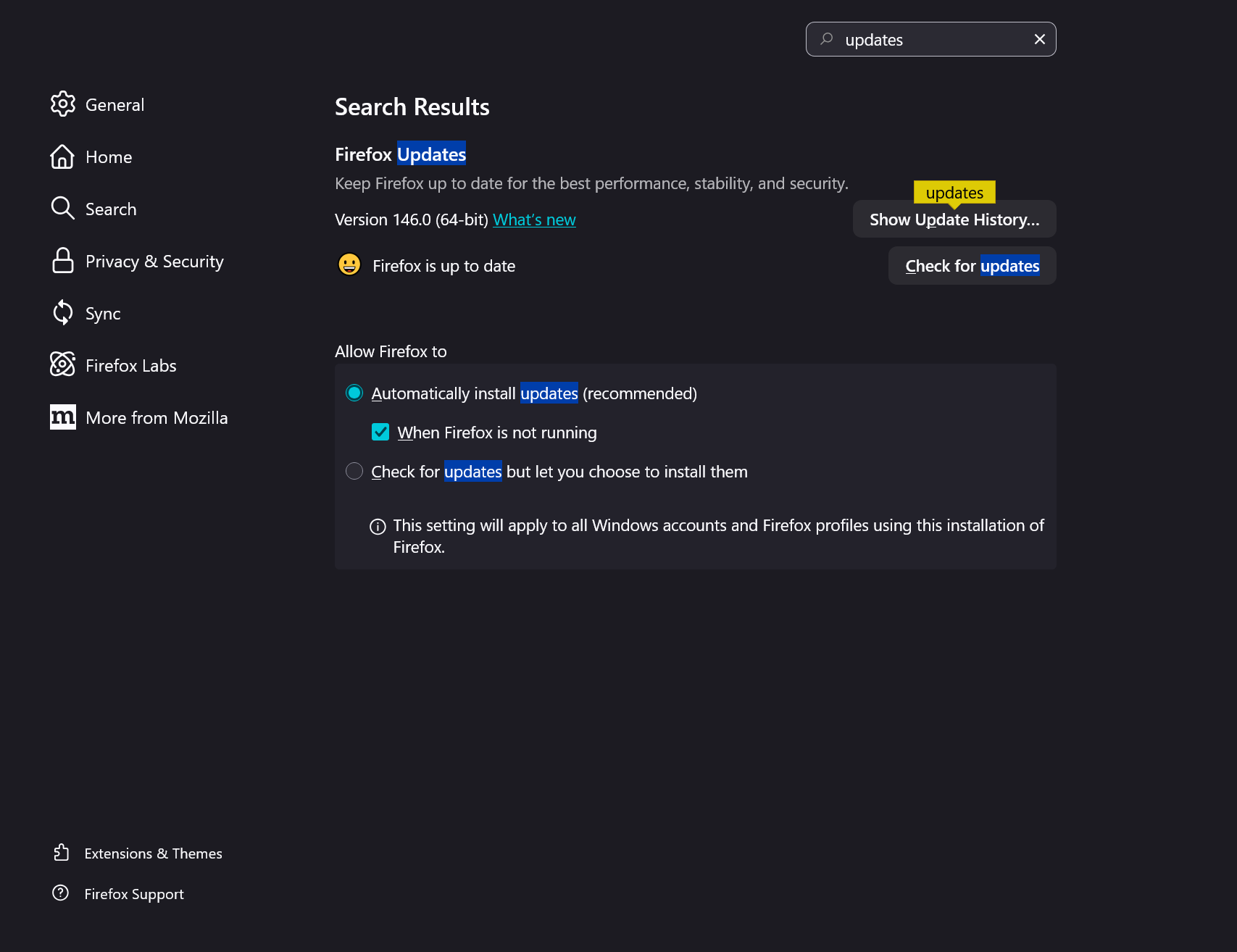I updated to version 146 today on Windows 10 and had to use administrator credentials. I have Mozilla Maintenance Service previously installed. I tried uninstalling MMS and then re-installed FF using full installer and selecting the custom option to install MMS. I cannot see the option in Settings..General 'Use a background service to install updates' (Screenshot attached) How can I fix this issue which has been present for some time?