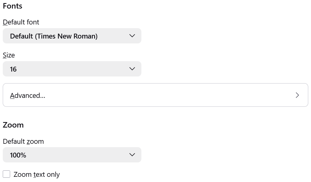 - A bit further down, there will be a subsection for Zoom. Use the drop-down menu for Default zoom to select a zoom level for all pages. Firefox will still remember individual site zoom levels you set.