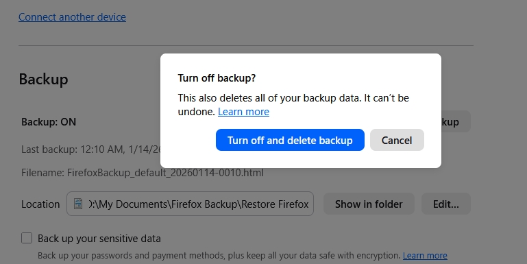 Now there's another wrinkle: If I try to turn Backup off, it demands that my current backup be deleted!!!