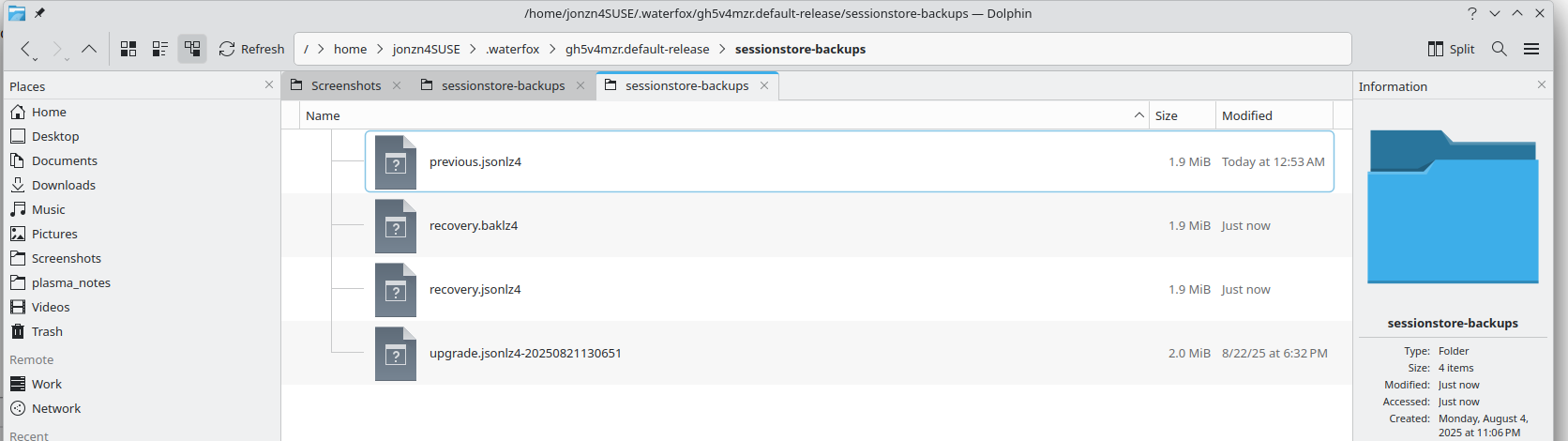 Post a screenshot from the folder sessionstore-backups in your profile folder. see screenshot of mine What are your settings for Firefox when you close the browser? see screenshot You cannot have it delete browser history when it closes.