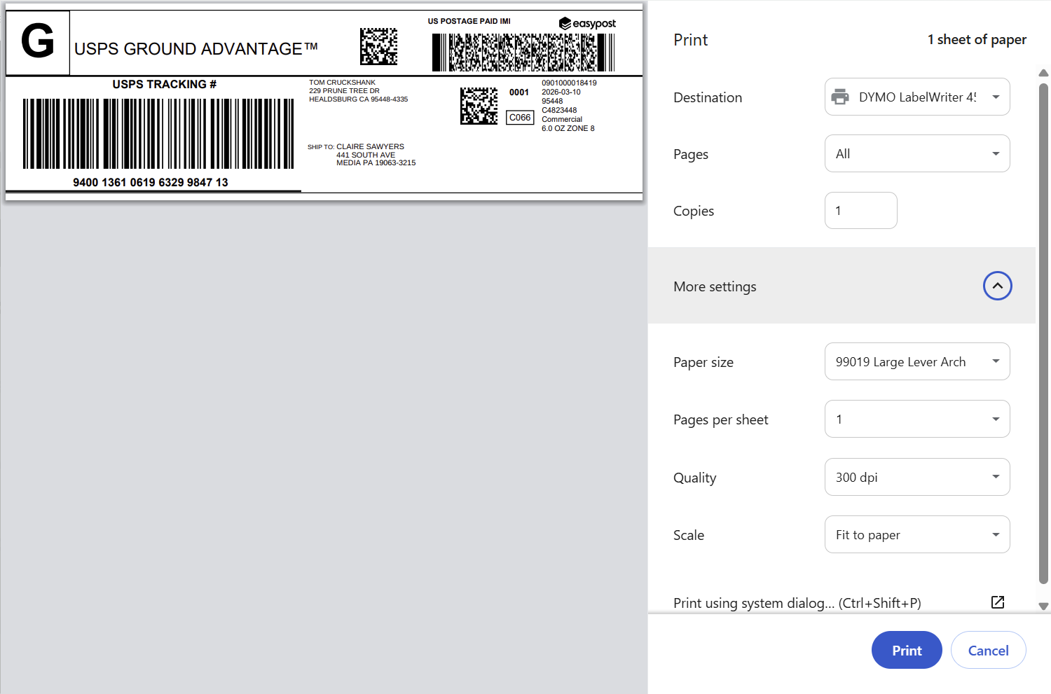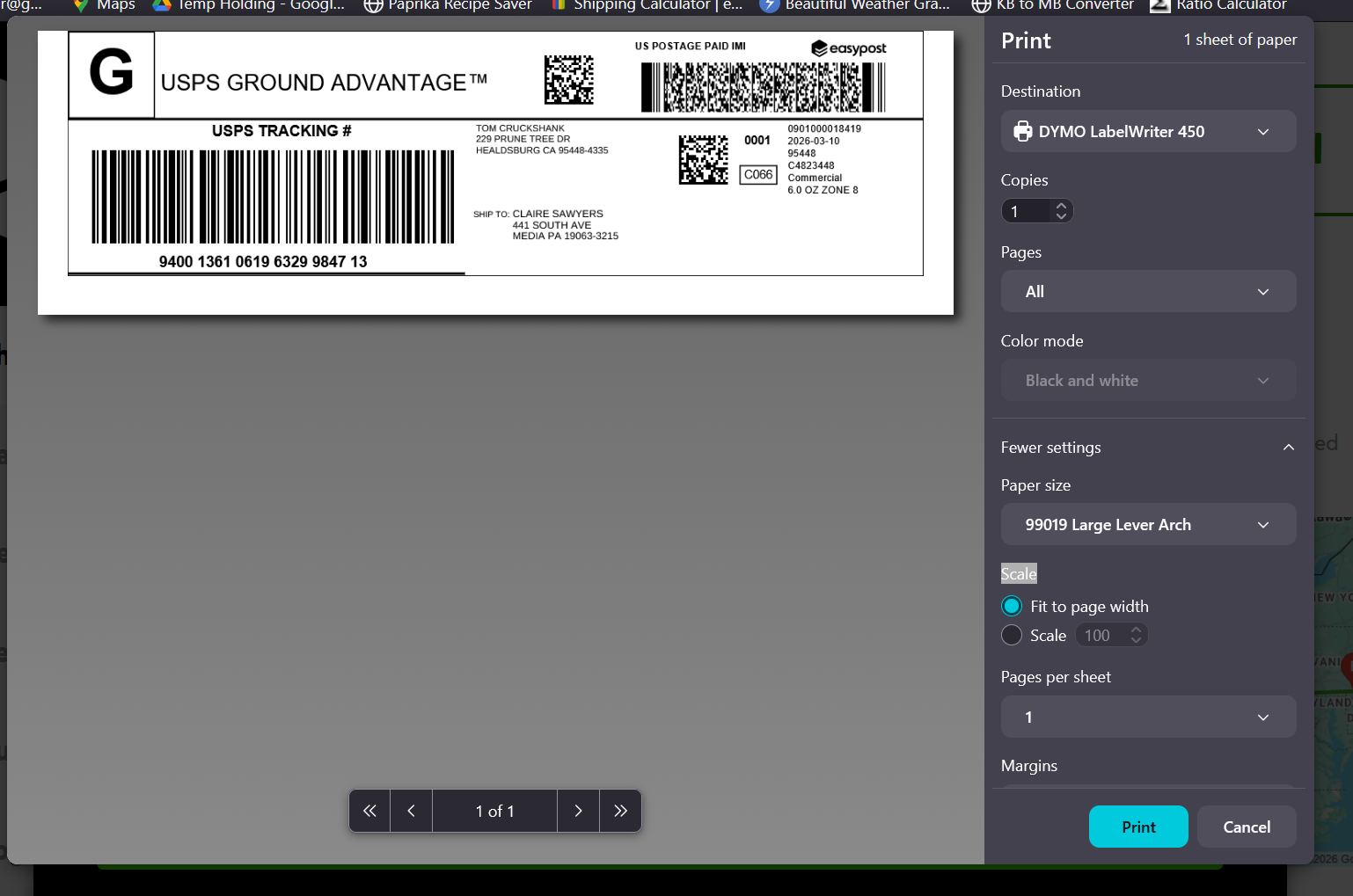 I just switched to Floorp from Chrome. When I try to print a shipping label with my DYMO 450 labelwriter, I cannot get the label to fit properly as I can with Chrome. It is an issue with the print dialog in Floorp. It does not have the "fit to paper" selection in scale section of the dialog. This makes the label print not near as well as in Chrome. I will be switching back to Chrome unless this can be addressed. See the 2 screenshots attached to see the issue.