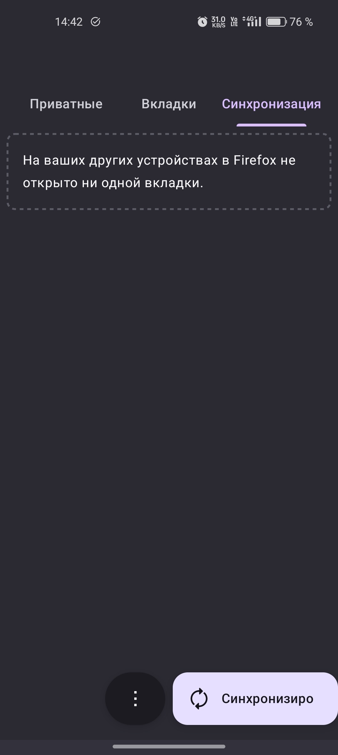Добрый день. У меня всё было хорошо, и ранее с телефона всегда были доступны синхронизированные вкладки, которые открыты в браузере на ПК, однако недавно мне понадобилось разлогиниться на телефоне, потом я снова залогинилась, и с тех пор у меня возникла с ними проблема. Вкладки просто пропадают сами по себе спустя время. Чтобы они снова появились, мне нужно оказаться у своего домашнего компьютера и открыть Firefox, и осуществить синхронизацию (если она не успела произойти автоматически). Тогда какое-то время эти вкладки появляются в Firefox на моём телефоне с Android,.. а спустя время снова пропадают. Это очень неудобно, потому что я не могу, находясь на работе или в поездке, комфортно воспользоваться вкладкой, использованной на домашнем компьютере. Раньше эти вкладки были доступны всегда, и я всегда была спокойна и уверена, что могу к ним обратиться. Что делать? Помогите, пожалуйста. Прикрепляю скриншот, где видно, что вкладок нет (к сожалению, сейчас не могу сделать скриншот, где они есть, поскольку в данный момент времени я нахожусь на работе).