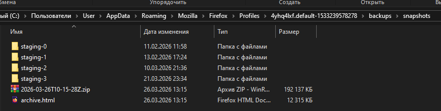 lastBackupAttempt:1777034400; (2026-04-24T12:40:00.000Z) errorCode: name:BackupError; stack:#prepareStagingFolder@resource:///modules/backup/BackupService.sys.mjs:1976:25\n; unremovableContents: 0:C:\Users\User\AppData\Roaming\Mozilla\Firefox\Profiles\4yhq4lxf.default-1533239578278\backups\snapshots\2026-03-26T10-15-28Z.zip; 1:C:\Users\User\AppData\Roaming\Mozilla\Firefox\Profiles\4yhq4lxf.default-1533239578278\backups\snapshots\archive.html; 2:C:\Users\User\AppData\Roaming\Mozilla\Firefox\Profiles\4yhq4lxf.default-1533239578278\backups\snapshots\staging-0; 3:C:\Users\User\AppData\Roaming\Mozilla\Firefox\Profiles\4yhq4lxf.default-1533239578278\backups\snapshots\staging-1; 4:C:\Users\User\AppData\Roaming\Mozilla\Firefox\Profiles\4yhq4lxf.default-1533239578278\backups\snapshots\staging-2; 5:C:\Users\User\AppData\Roaming\Mozilla\Firefox\Profiles\4yhq4lxf.default-1533239578278\backups\snapshots\staging-3; lastRunStep:5;