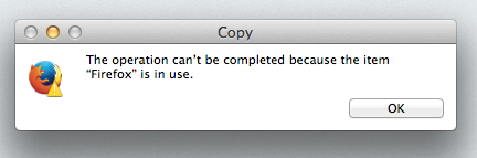 The solution posted doesn't work because I cannot delete Firefox from my Applications folder "because it's open". http://cl.ly/image/1L0D0m2Y3M1i