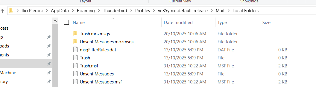 The computer User account called 'iliop' It uses this profile name folder: fws706fj.default-release That profile name folder contains all your files in 'Local Folders'.