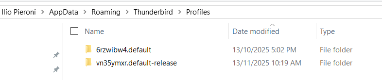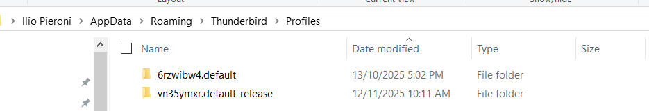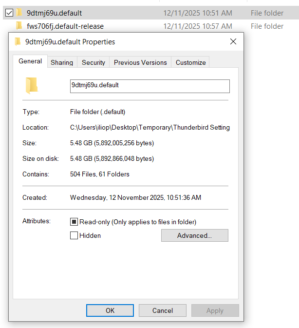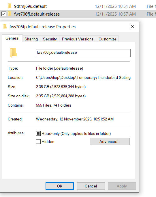 There is a total confusion about what have done in the last few days or even before tour first message in this forum. This is no reproach but just to explain why it is extremely difficult for a helper to build an entire image of a puzzle with a lot of different information pieces. Your recent screen shots with the properties of the 9dtmj69u.default and the fws706fj.default-release profile folders seem to indicate that you have moved your old profile folders to a "temporary" repertory on your Desktop. No idea, too, where this other Thunderbird installation with profile folders 6rzwibw4.default (13/10/2025) and vn35ymxr.default-release (12/11/2025) is located.