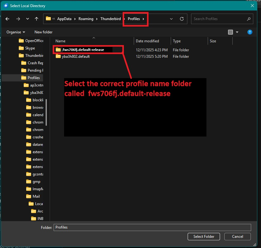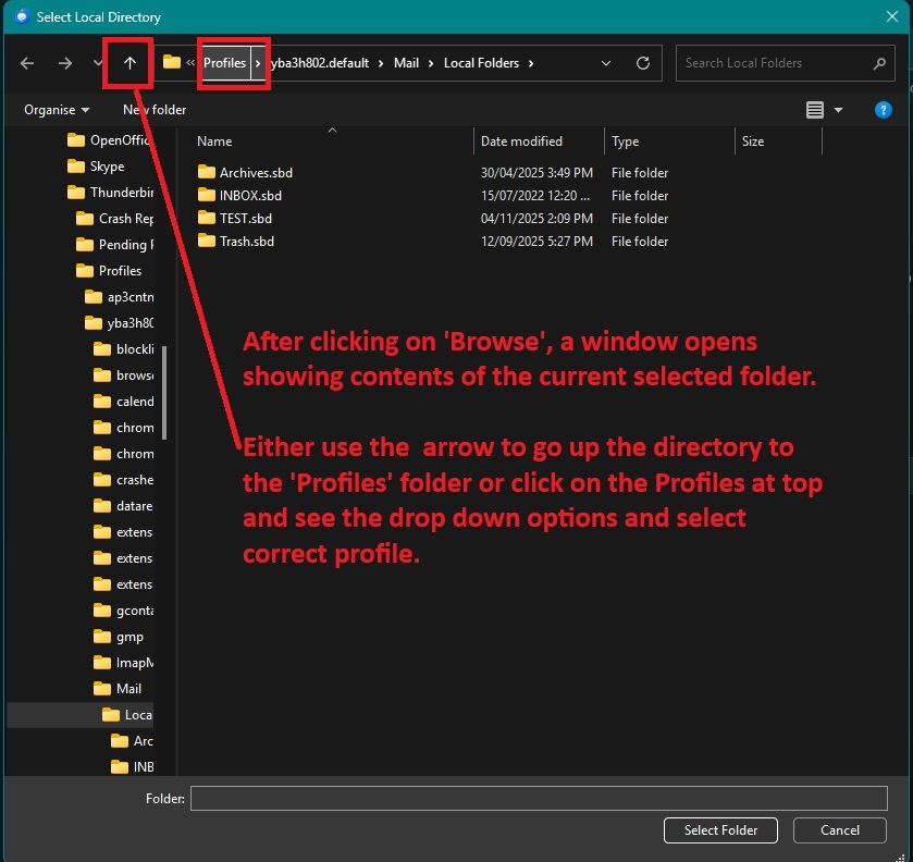 If it says something different click on the 'Browse' button It will open showing contents of current position, you can reselect the correct profile, Mail and Local Folders folder