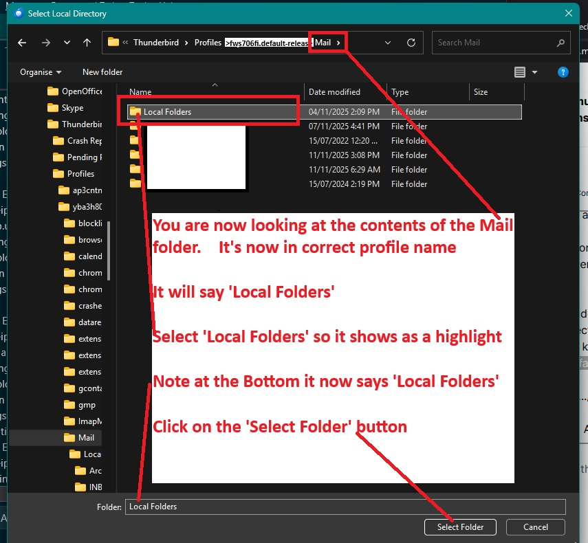 However, the 'Account SEttings' for 'Local Folders' is not pointing to that location. I did mention this earlier, but it seems you have done as advised.
