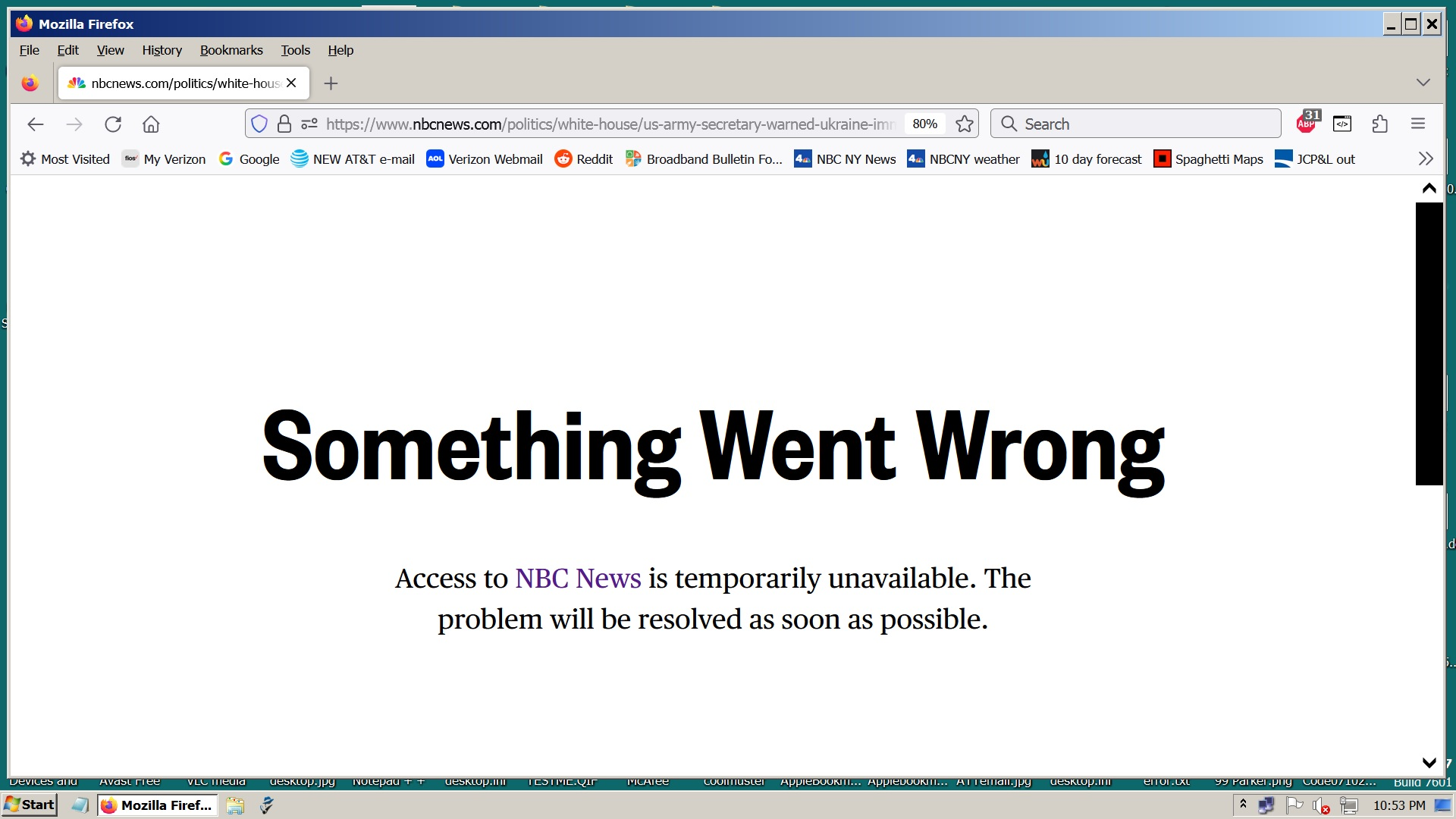 I visit the nbcnews.com web site frequently. For the past +/- 48 hours, I have been having issues. I can open the home page and scroll from top to bottom just fine. However when I now double-clcik to open a specific article, that article page opens for about one second and is then immediately replaced with a page that says "Something Went Wrong. Access to NBC News is temporarily unavailable. The problem will be resolved as soon as possible." This happens on whatever article I select. It also happens on 2 separate computers.