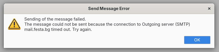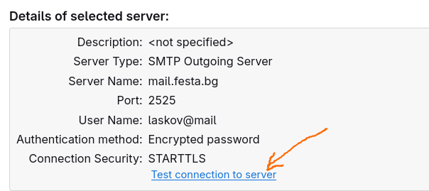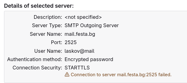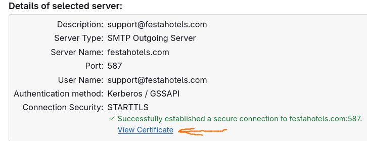 Hello, My SMTP server uses Let's Encrypt certificate. The website with the same domain has no certificate. Thunderbird refuses to connect to my SMTP server. Test connection to the server (STARTTLS) in account settings sais "The secure connection to the server failed" (or similar. I see bg localization). Another server with Let's Encrypt certificate. Test pases. Clicking View certificate shows webserver cert (from DigiCert Inc).