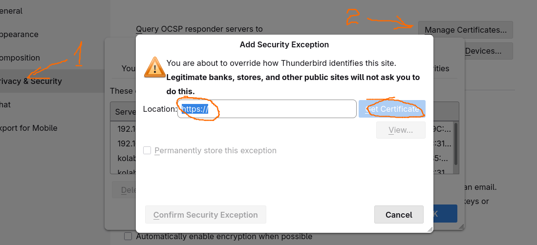 Additionally, I'm trying to add an exception for an SMTP certificate, but Thunderbird is looking for an HTTPS certificate, and there isn't one.