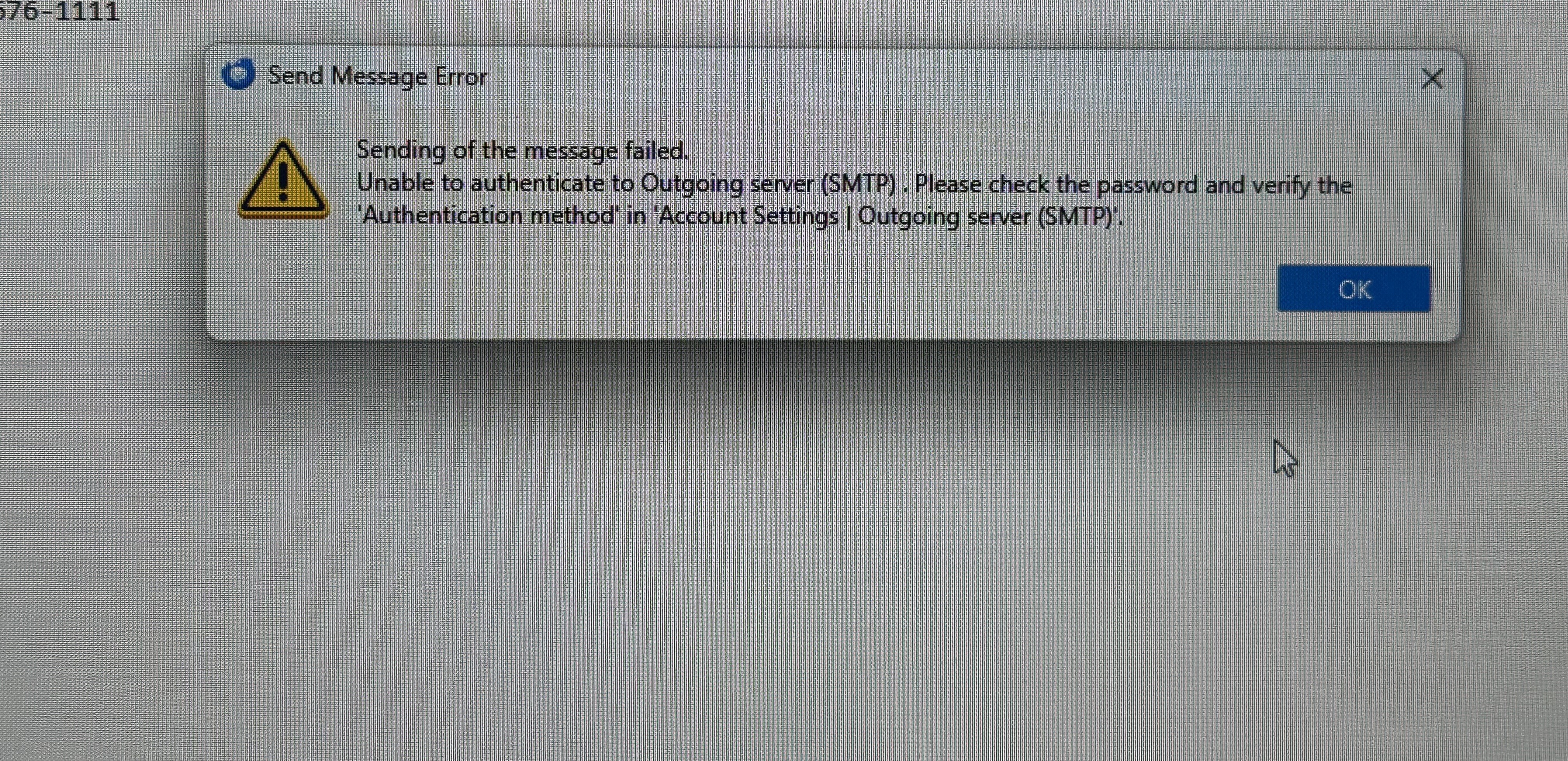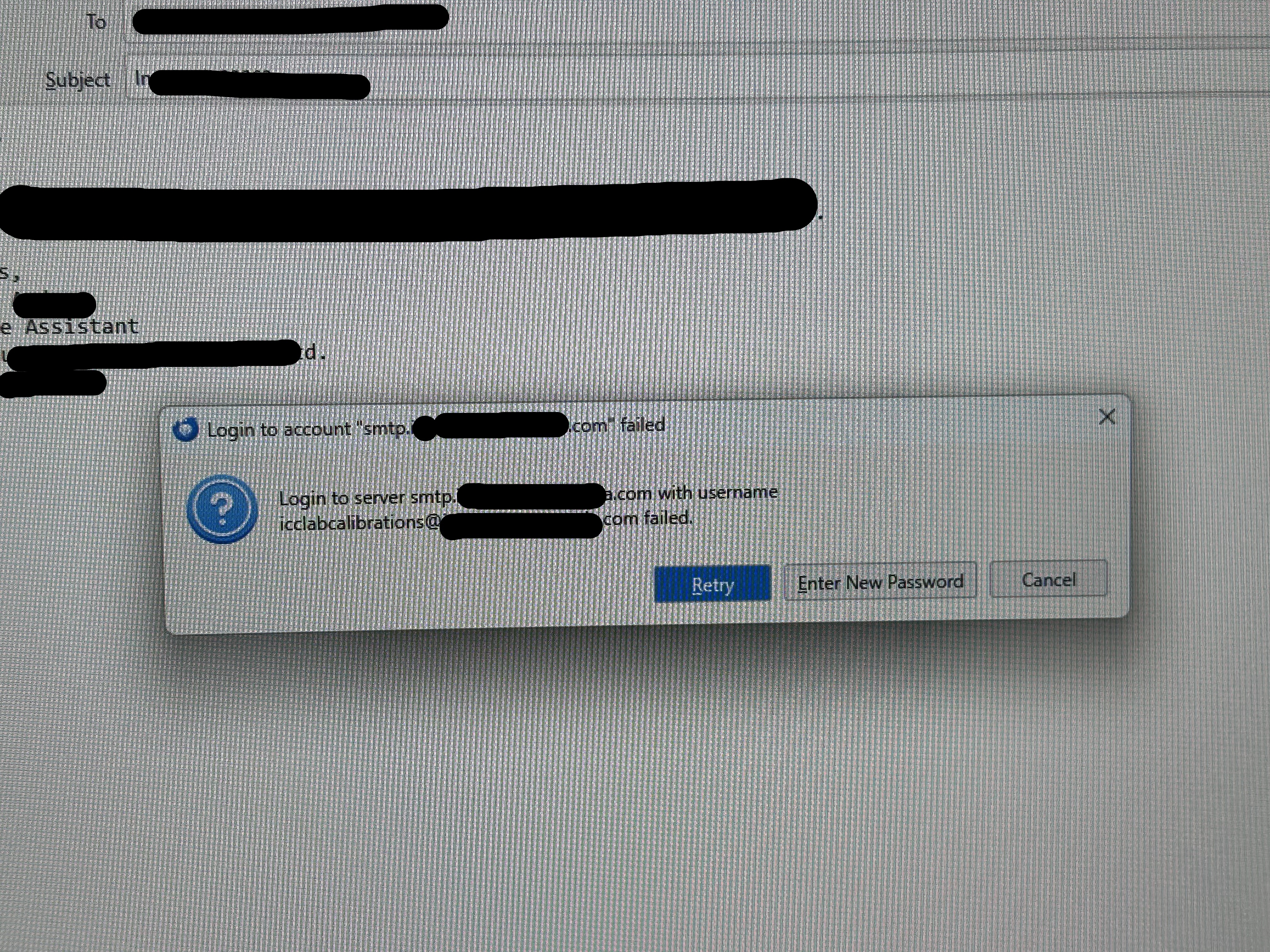 I am unable to send emails (but can receive). When I try to send an email with an attachment, I get the pop up that states "Login to server smtp.(companyemail).com with username icclabcalibrations@(companyemail).com failed". Once I hit "retry" twice, another message pops up that says "Sending of the message failed. The message could not be sent because the connection to Outgoing server (SMTP) smtp.(companyemail).com timed out. Try again." Once I try again, a third message pops up saying "Sending of the message failed. An error occurred while sending mail. The mail server responded: ...authentication rejected. Please verify that your email address is correct". I have made sure to check that the connection security settings are correct as well as the outgoing server settings. I have also edited my email and replaced it with "(companyemail)" for privacy reasons.