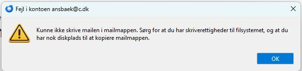 Error in account (my account) Could not write mail in mailfolder. Ensure that You have writing rights to the filesystem, and You have sufficient disk space to copy the mailfolder.