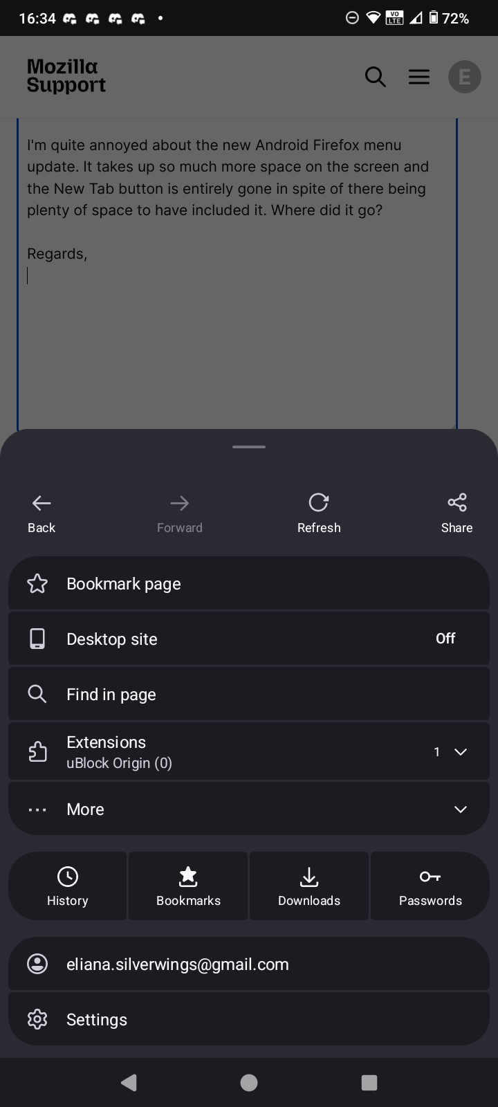 I'm quite annoyed about the new Android Firefox menu update. It takes up so much more space on the screen for not really adding any extra usability and the New Tab button is entirely gone in spite of there being plenty of space to have included it. Where did it go? I'd really prefer to have it back.