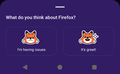 This appears on almost every opening of the app. Clicking on "It's great!" asks me to leave a review on Play Store. Clicking on "I'm having issues" asks me to leave feedback at Mozilla Support forums. I don't want to do either, I just want the popup to go away and never return. I keep seeing it even after having already clicked both buttons several times.