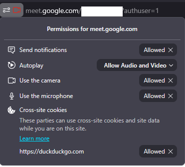I have tried removing camera and microphone permissions to meet.google.com and re-granting them. I have tried deleting all meet.google.com cookies and storage.