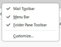 I'm confused now (my turn, I know): What are you doing with icons? I want you just checking (ticking) the three lines of words in the little window in my shot on the left. I don't want you moving icons from the big window screenshot on the right. When you tick Mail toolbar, Menu bar, and Folder Pane bar, they should all show up above your list of messages in the Inbox view.