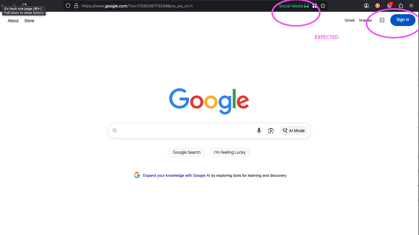 Expected: When I open a new tab in a container, and I go to google.com, that the Firefox tab remain in that green container tab type and not switch me to a different tab type where I'm signed in to Google and it's tracking me.