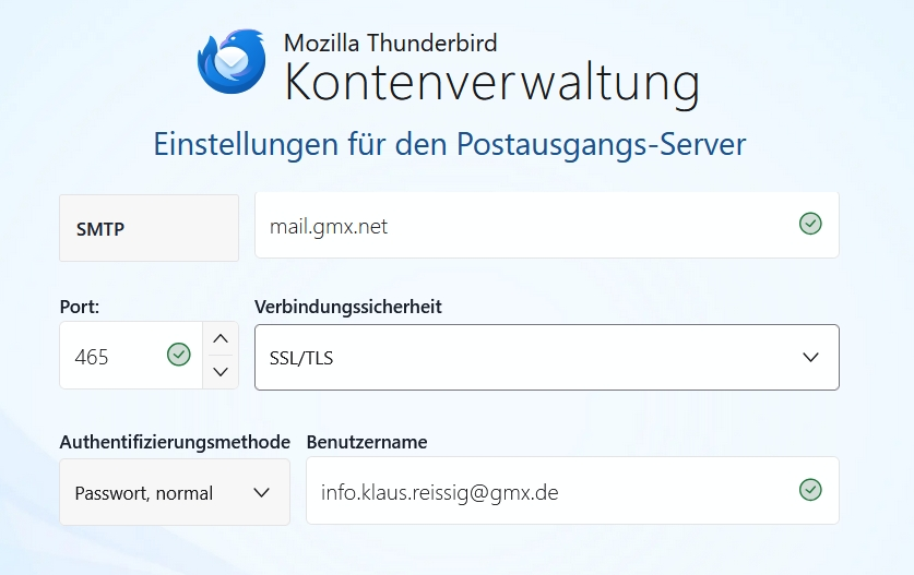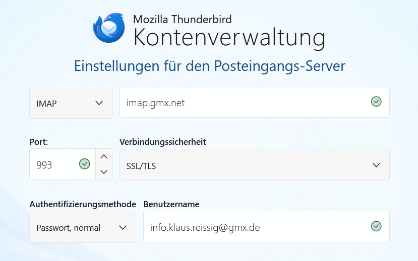 Sehr geehrte Damen und Herren, ich habe neulich bei GMX einen neuen E-Mail-Account eingerichtet, der auch innerhalb GMX problemlos funktioniert. Bei der Integration in das Programm Thunderbird gibt es jedoch Schwierigkeiten, obwohl ich sämtliche Serverparameter korrekt angegeben habe. Ich konnte den E-Mail-Account nicht einrichten (s. Bild im Anhang). Was habe ich falsch gemacht? Mit freundlichen Grüßen Klaus Reißig