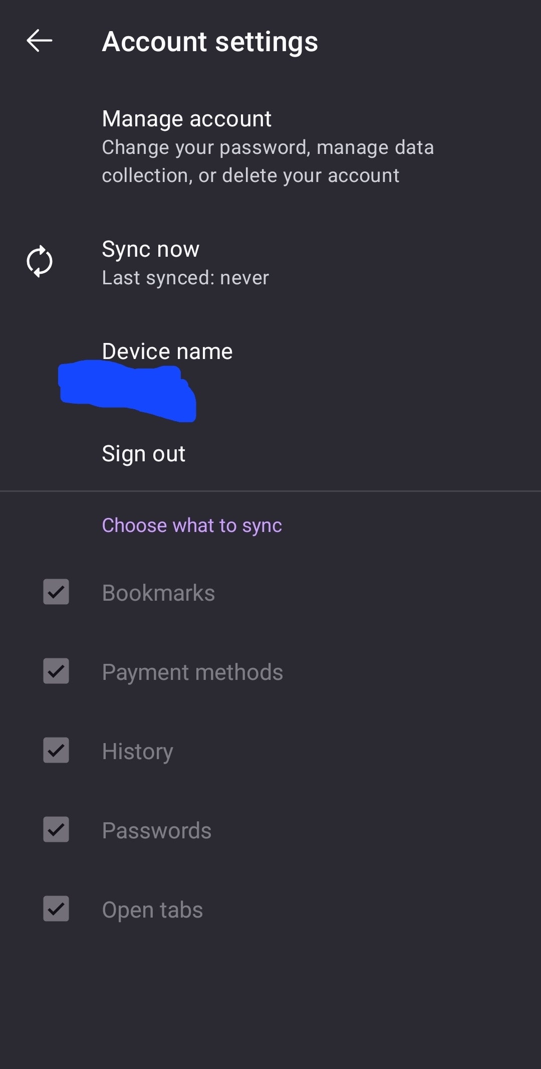 I have tried logging out and logging back in on my android firefox. accounts.firefox.com shows it is logged in, yet I do not see my firefox on android listed in my "Tabs from other devices"/"Synced tabs", in fact, I do not see any other device tabs listed. On my android firefox, it shows that I am logged in, yet the checkmarks for choosing what I want to sync are all disabled, the sync now button can be clicked but does nothing. I have tried logging out, forced stopping firefox app, and restarting android, nothing worked.