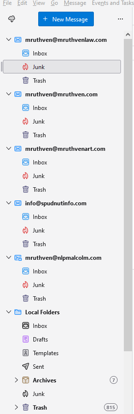 After my email provider changed some things, to get TB to work I had to delete and add back my five email accounts (discussed in another thread). All those email accounts now work, but their visual presentation is very different (and worse in my opinion). Before, there was one Inbox, Junk, and Trash, all under Local Folders. Now, there are five (one for each email account) sets of Inbox, Junk, and Trash. They appear above Local Folders which now contains only items put there before my problem started.
