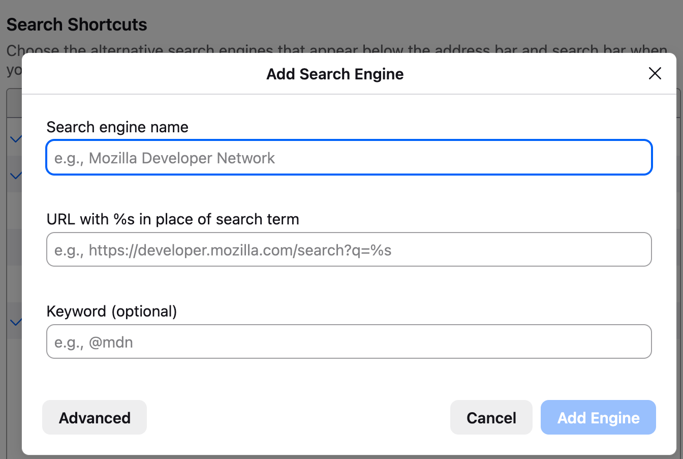 Custom Search Engines: Firefox now supports adding even more search engines. To add a custom engine, right-click a search field of a supported website and select “Add Search Engine”, or go to Settings > Search > Add (below the search shortcuts table) to manually enter a search URL.