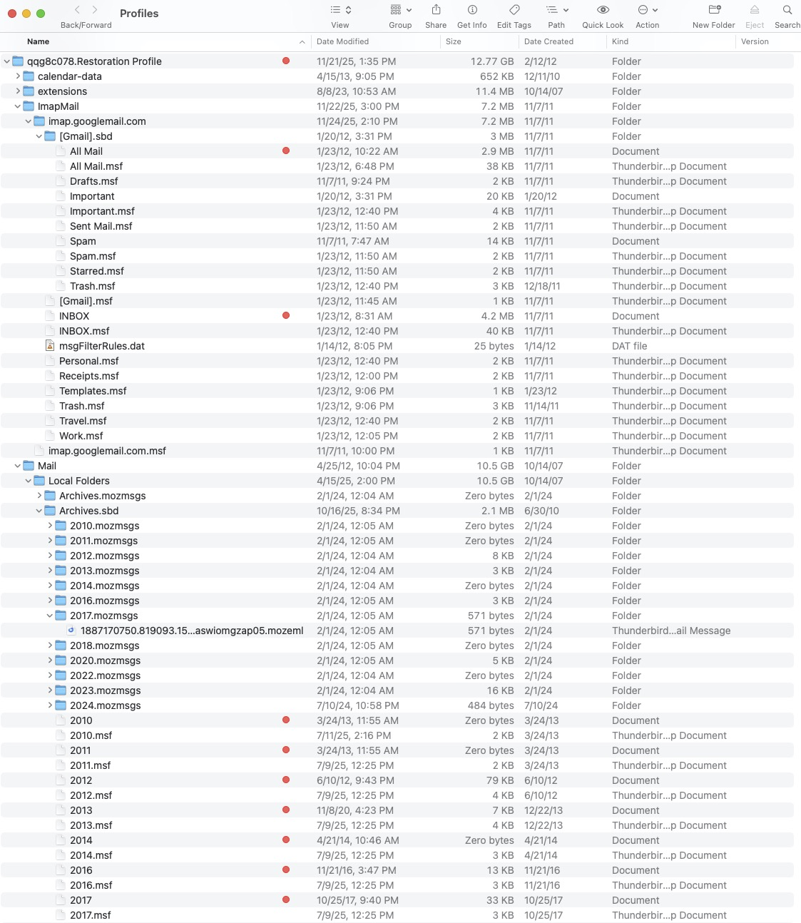 May I give a hint? Those mozmsgs folders are polluting the whole "Restoration profile" folder. I propose to start cleaning up the profile by deleting all this mozmsgs crap. After that it would be easier to navigate in the profile folder and concentrate on the essential mbox (message) files. Not to forget .sbd folders which may contain other message files (representing the sub-folders of the parent folder).