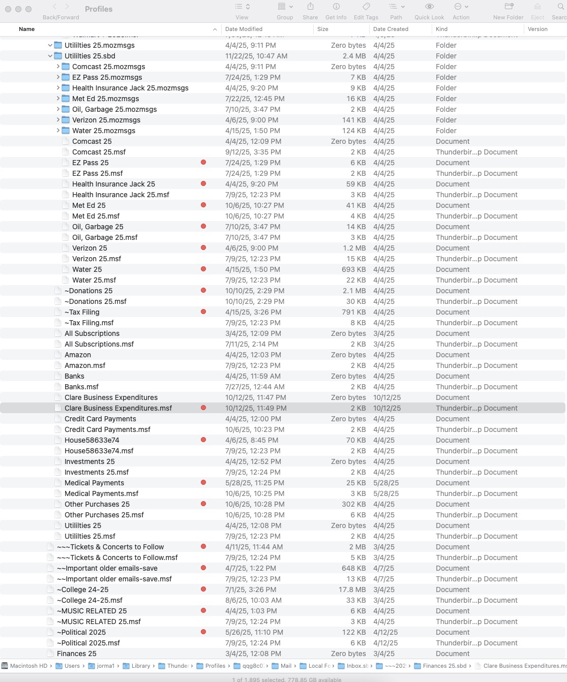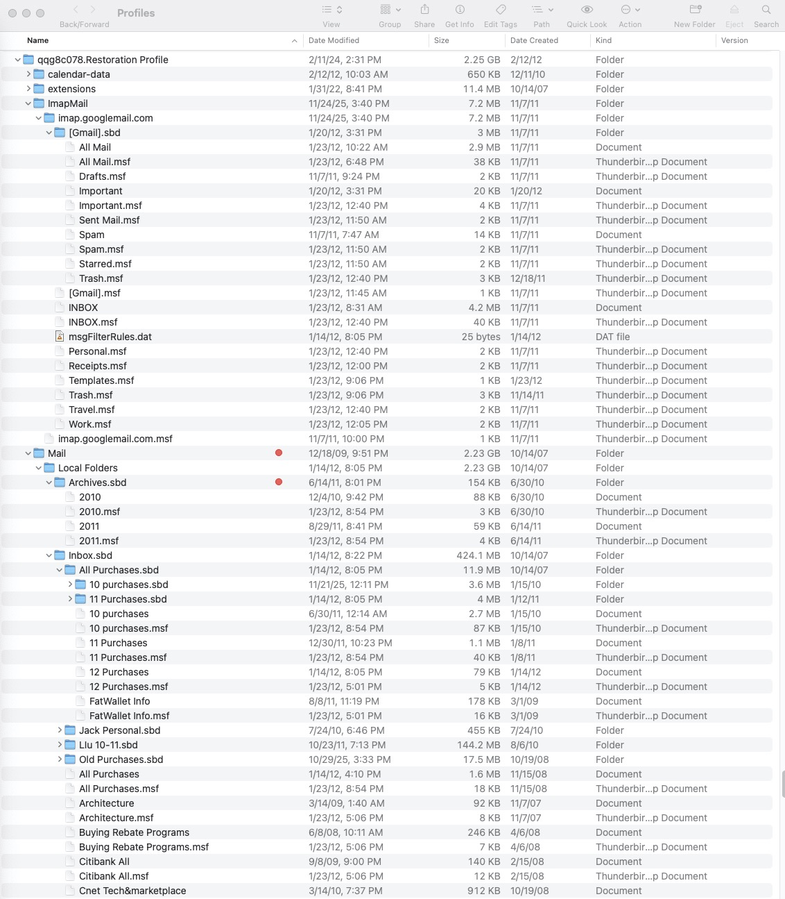 Yeah that's what I'm starting with. I remember. I've gathered all these profiles together, and I'm going to go through all of them to search for exactly that, the .msf file paired with the non-msf file. I had a few on the new mini that I just copied and brought back. I'm looking through the Imap folders and Mail folders (including Local folders) for larger entries on the non-msf files. I will post again as I get through these and highlight them on my drive this afternoon. Thank you again, Jack M.