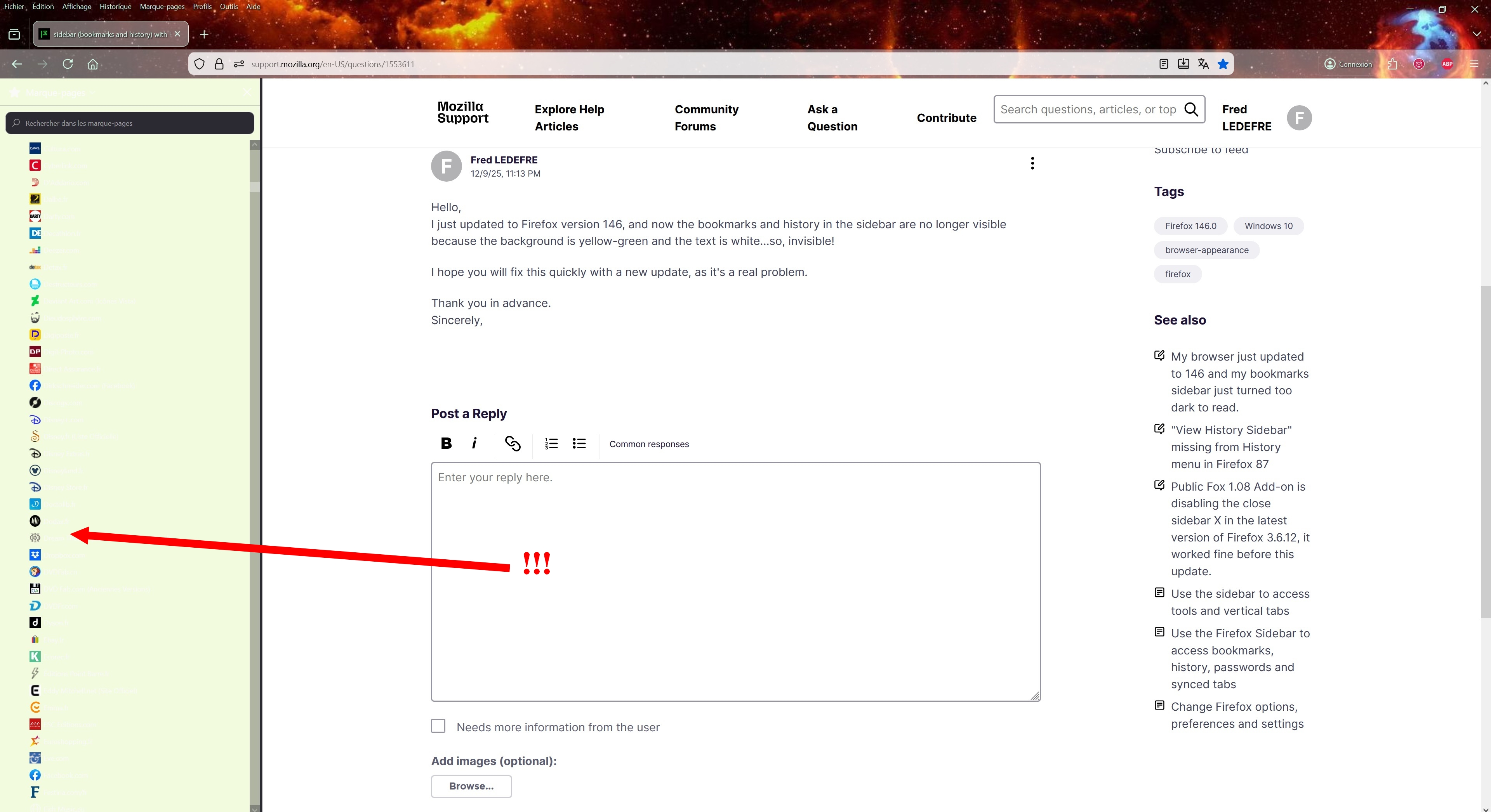 Hello, I just updated to Firefox version 146, and now the bookmarks and history in the sidebar are no longer visible because the background is yellow-green and the text is white...so, invisible!