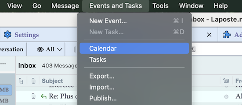There are at least two menu options to open the Calendar tab: a) menu Events and Tasks > Calendar b) in the upper left corner click on the "Open spaces menu" button > Calendar or keyboard shortcut Ctrl + 3