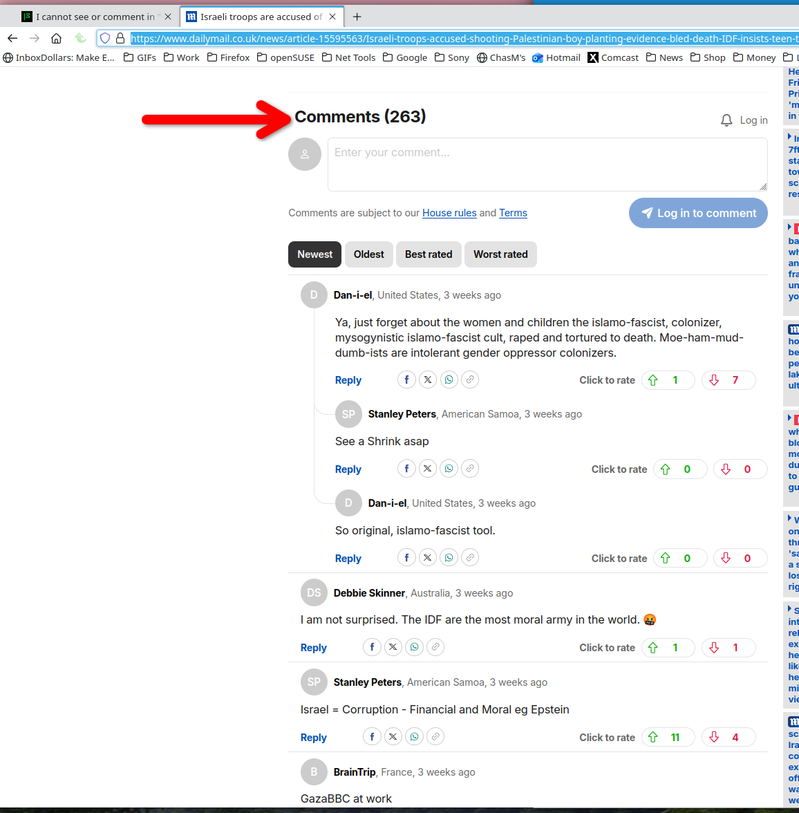 Show the issue. I see comments in this story. see screenshot https://www.dailymail.co.uk/news/article-15595563/Israeli-troops-accused-shooting-Palestinian-boy-planting-evidence-bled-death-IDF-insists-teen-terrorist-posing-immediate-threat.html