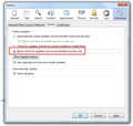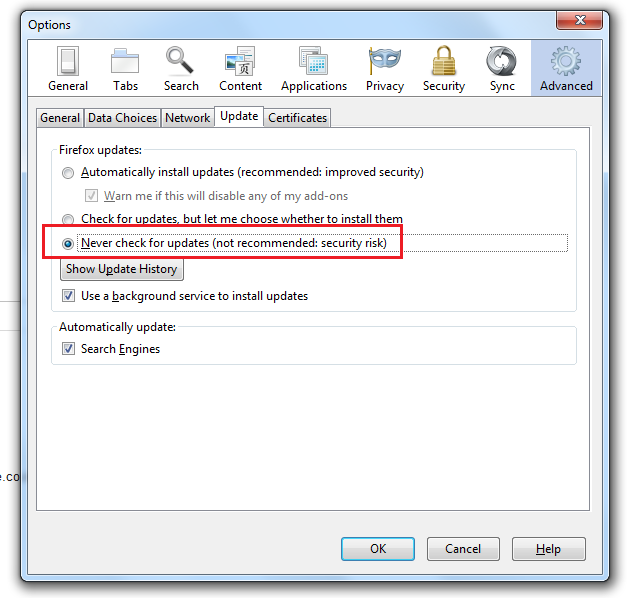 Go to main menu > Tools > Options > click on Advanced tab > click on Update tab and then click on the round radio button that says Never check for updates (not recommended: security risk)