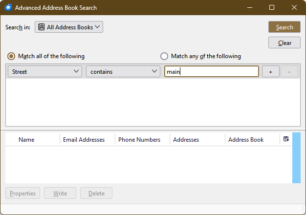 linux 21.3 Virginia, thunderbird 115.18.0 how do i look up a contact via a street name or A zip code in all address books