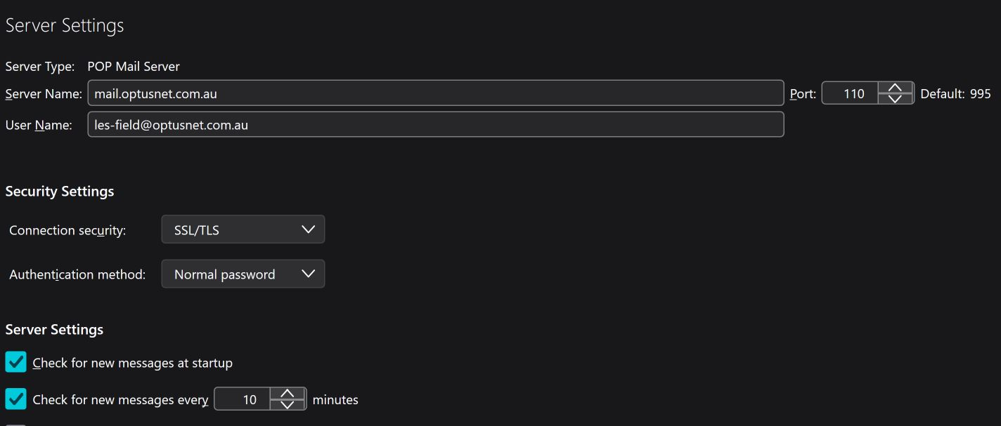 Settings have been verified with the provider support staff and password has been changed. Mail is visible in the provider's webmail page verifying that the password is OK. As I have said several times, I can SEND in Tbird but not DOWNLOAD because there is no 'mailbox' server in the SECURITY > PASSSWORDS section of Tbird settings. I use the latest 64 bit version and my wifeuses the 32 bit version and her account is a sub account of my original account, originally accounts could use up to 5 email addresses which Optus is gradually whittling away as new accounts DO NOT get an email account. My wife's settings in SECURITY > PASSWORDS show both a mailbox server and SMTP server. I do NOT know how to add the mailbox server!