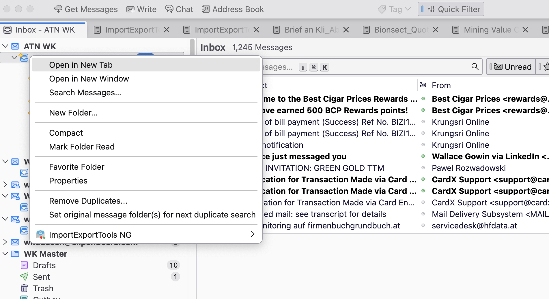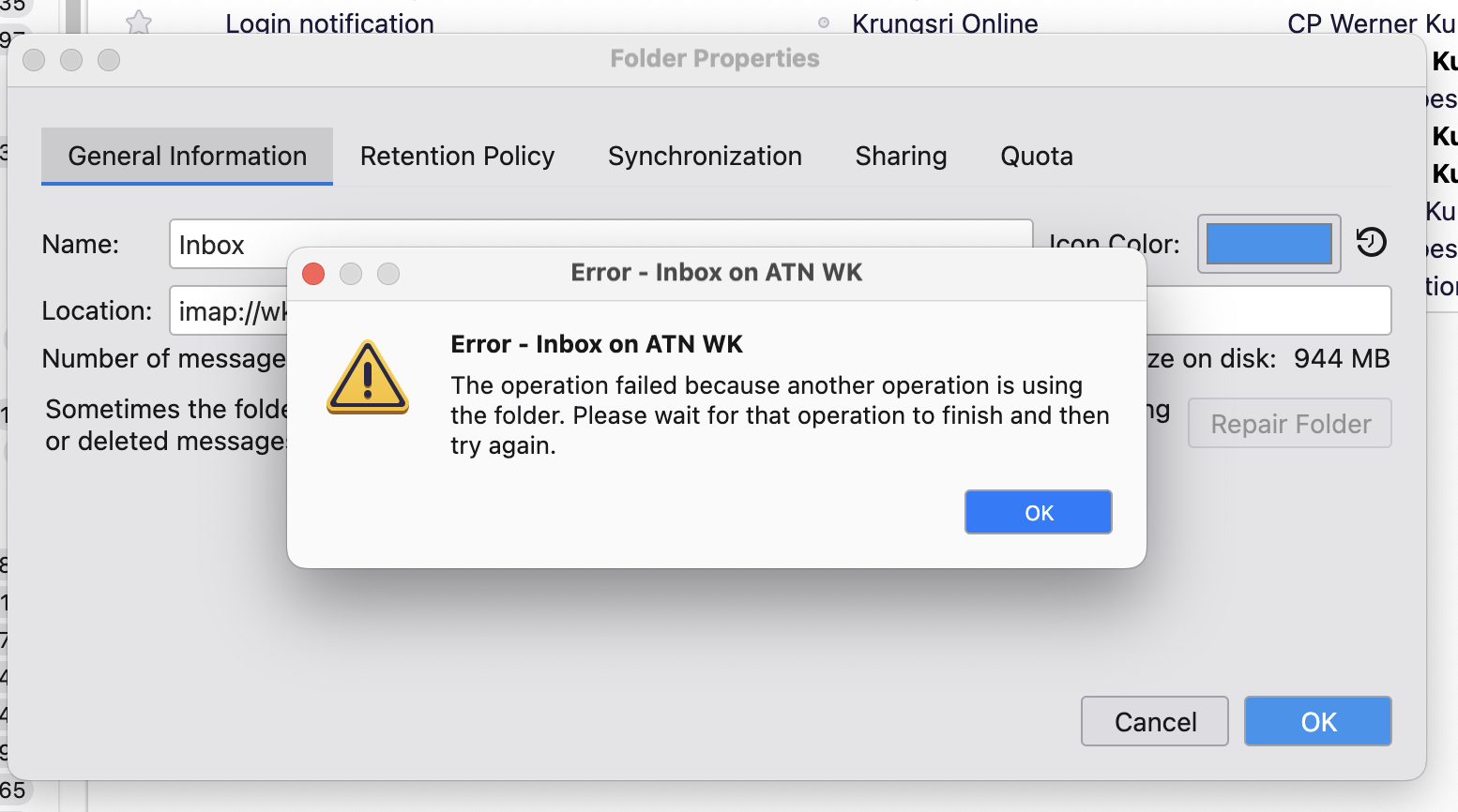 Hi Chris, please forgive my super-late reply, but I just found your message while cleaning up my 'SaneLater' Folder with over 5,000 Mails (what a digital Tsunami ... not all Spam, some legitimate Emails too, so I gotta browse carefully) ... in any case, I tried your kind suggestion, but after I clicked 'Repair Folder' there was no progress indication and when I clicked again it said, its busy with another task ... see attachments ... so not sure how long I should wait for the 'Repair' to be finished ?? Please advise ... and this time I will look out for your reply, hopefully in my IN-Box Thanks again, Werner