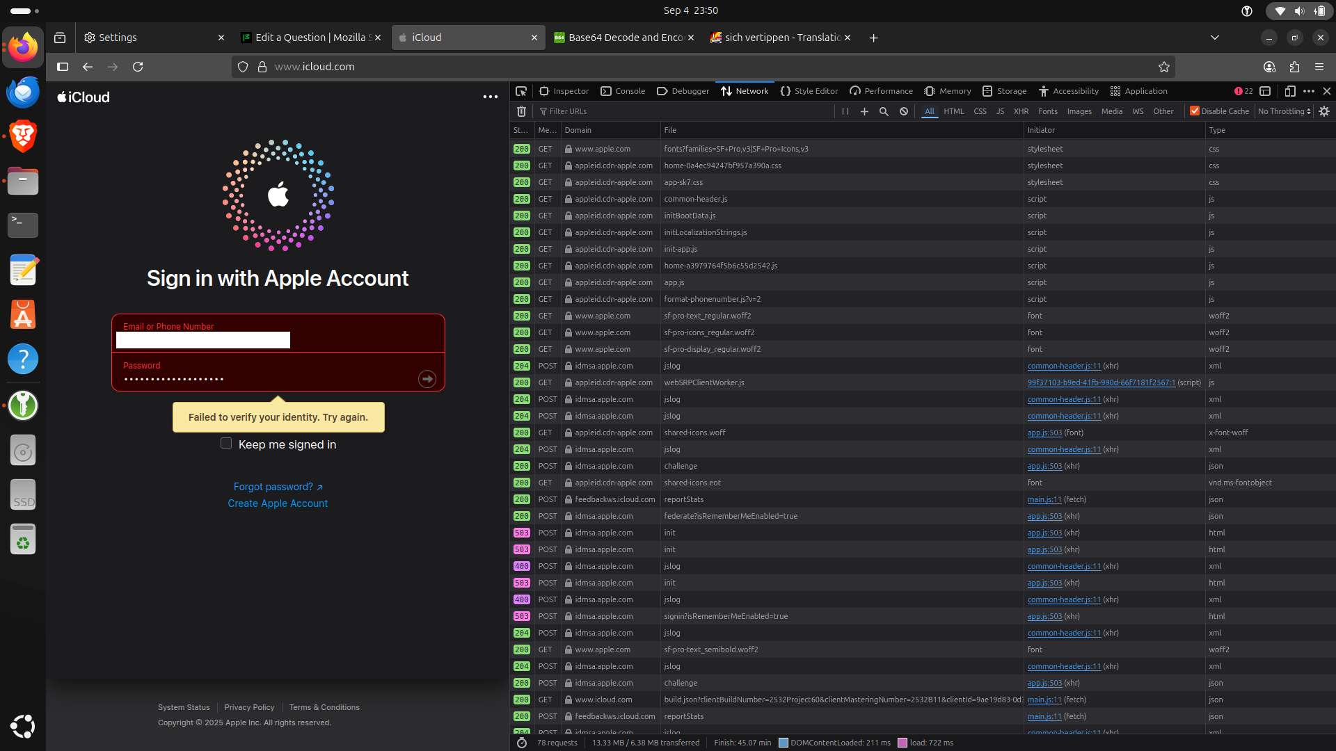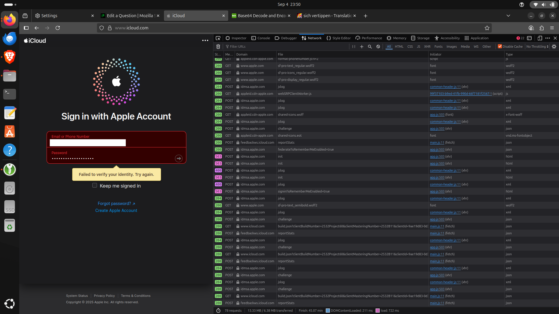 Hi, I'm using Firefox 142 on Ubuntu 24.04. It's a fresh install. I cannot sign in icloud.com with Firefox even though it works with other browsers like Brave. I deleted all cookies and site data and disabled extensions (KeePassXC). It doesn't help. I tried in new private window. No success. I copy my password from a password manager, so, no, I haven't mistyped it.