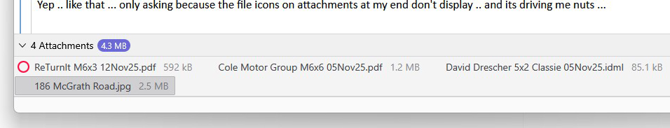When I add attachments when replying to emails, the file icons on those attachments don't display. This only happens when replying, the file icons display when receiving emails. Have tried many things to fix this including using ChatGTP with no luck. What can I do to fix this?
