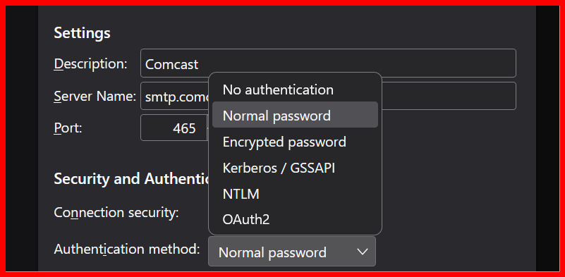 2. TB automatically defaults the authentication method to OAuth2 instead of 'normal password' for comcast.net. ****** This is a big issue for TB ******