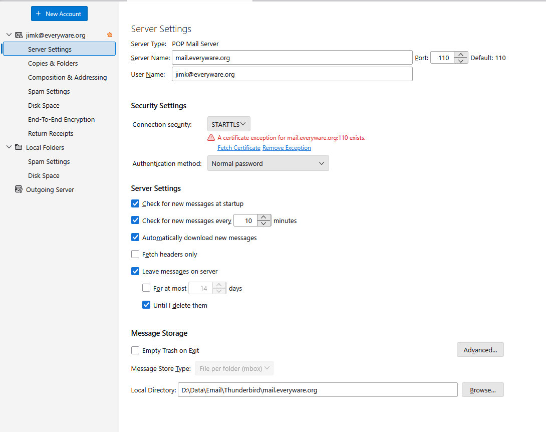 I have multiple email accounts and lots of folders under each. The one I have tried to connect to the old data is pointed at "D:\Data\Email\Thunderbird\mail.everyware.org" in the account settings, and it retrieves my email fine but I can't see any of the existing email.