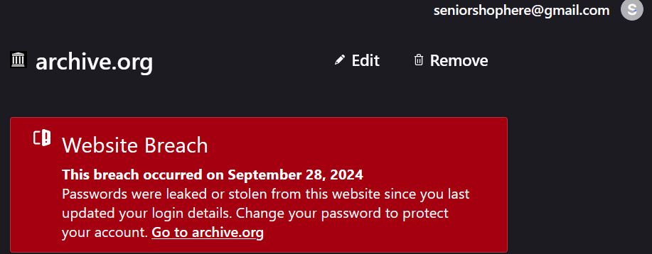 When I went to my Firefox password page there was a red banner saying my website was hacked and my passwords stolen a year ago. That message was not on that page a month ago. Please advise urgently.