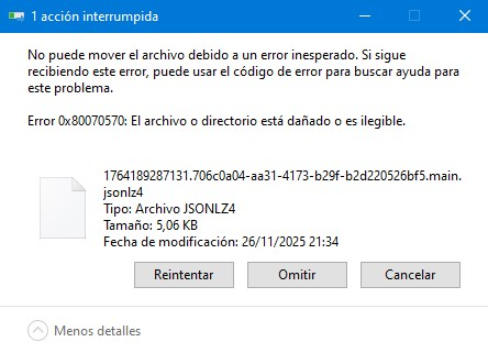 Por otro lado, he intentado copiar directamente la carpeta Profiles. Se inicia la copia y de pronto se interrumpe apareciendo un aviso de que el archivo 1764189287131.706c0a04-aa31-4173-b29f-b2d220526bf5.main.jsonlz4, ubicado en la ruta C:\Users\Usuario\AppData\Roaming\Thunderbird\Profiles\g3snubiu.default-esr\datareporting\archived\2025-11, NO SE PUEDE MOVER debido a un error inesperado. Error 0x80070570 "El archivo o directorio es ilegible o está dañado". Adjunto imagen del aviso. El resto se copia bien, excepto este archivo en concreto. La otra duda que tengo a este respecto es si es un archivo muy importante o no lo es; y si lo es, cómo puedo salvar la prohibición de copiarlo, si ello es posible.