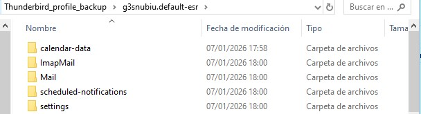 Hola. Para mi tranquilidad, quiero guardar una copia de mi perfil completo de Thunderbird. 1. Utilizando la herramienta de Exportación, he conseguido un archivo zip (Thunderbird_profile_backup) el cual al descomprimirlo, compruebo que contiene una única carpeta (g3snubiu.default-esr, con 5 carpetas y 64 archivos).